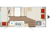 Wat betreft de indeling voor het gezin van de caravan zit u goed. Er is een heerlijk frans bed (200x145-106) voorin aanwezig. Hier valt er na een dag actief of ontspannen recreëren lekker in te slapen. Achterin bevindt zich het stapelebed voor de kinderen (210 x 80-70 / 210 x 80). Verder is er ook een fraaie middenzit die om te bouwen valt naar een 1-persoonsbed (190 x 110). Een keukenblok met een 3-pitskookplaat en spoelbak en naast de keuken een hoge koelkast. Verder is er een ruim toilet met wastafel, hangkast en vele opbergmogelijkheden voor de bagage. Uiterlijk is de buitenafwerking uitgevoerd met een mooie B66 bestickering in grijs en bronstinten.