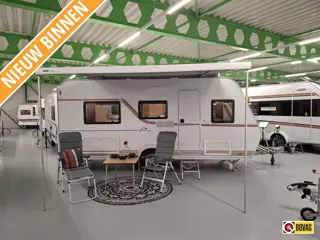 Mooie, jong gebruikte caravan voorzien van een cassetteluifel en een fietsendrager op de dissel.