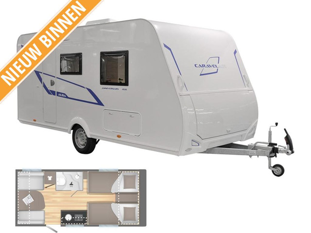 De Alba 450 Anniversary is een compacte caravan met een binnenlengte van slechts 4,7 meter. Toch biedt hij verrassend veel ruimte. De caravan beschikt over een toilet, een ruime zitgroep en twee eenpersoonsbedden. Liever tegen elkaar aan liggen? Dat kan, want de bedden bouw je eenvoudig om tot een groot kingsize bed van 1,95 bij 2,10 meter. Het luxe Ambition-pakket zorgt voor een topuitrusting bestaande uit een AKS stabilisator, schokbrekers, reservewiel plus houder in de disselbak, serviceluik (100 X 40 CM), groot dakluik (70 X 50 CM), 86 liter compressor koelkast, premium matras, hordeur, extra ledspotjes met usb-aansluiting bij het vaste bed, vers watertank van 50 liter, afvalwatertank, boiler van 5 liter en een douche uitrusting.
