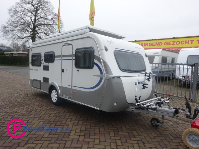 Subliem Mooie Eriba Feeling 425 met Vast Bed en Zitje tevens zgan Thule Vaste Luifel aanwezig en Thule Fietsendrager