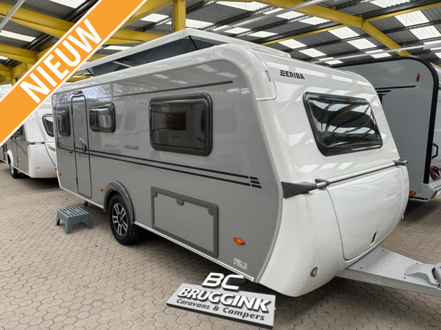 De Feeling 470 heeft achterin de caravan een standaard zit, een middenkeuken, middentoilet en voorin de caravan bevinden zich de 2 enkele bedden.