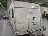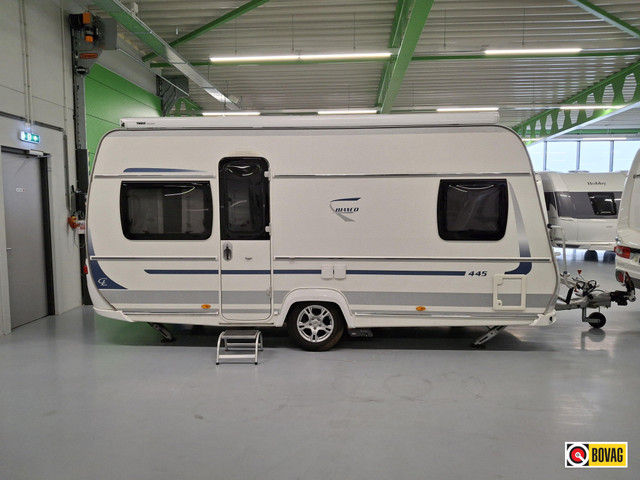 Mooie occasion, compleet met cassetteluifel, halfautomatische mover en een reservewiel onder de caravan.