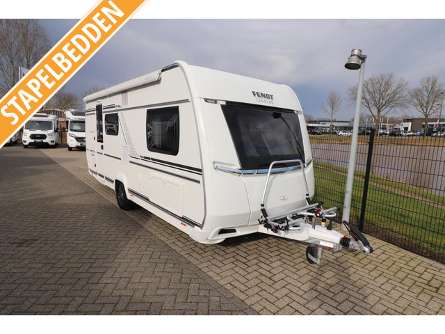 Prachtige Fendt 515 SKM Bianco Selection met stapelbedden achterin. Ideale gezins caravan. Caravan is voorzien van 2000 kg as + LM velgen, voortent en fietsendrager voorop.