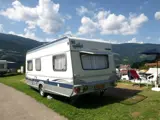 De caravan heeft een rondzit en een vast bed. De caravan is incl twee tenten een grote voortent van 3.00 m diep en een klompentent.