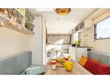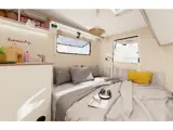 Binnen word je verwelkomd door een rustgevende, Scandinavisch geïnspireerde inrichting met lichte kleuren en natuurlijke materialen. De ruimte voelt open en luchtig aan, terwijl de praktische indeling ervoor zorgt dat alles klopt. De zithoek vormt het hart van de caravan en is in een handomdraai om te bouwen tot een comfortabel slaapgedeelte. Dankzij de modulaire opzet pas je de indeling eenvoudig aan jouw reis aan – van een royaal tweepersoonsbed tot een gezellige zitruimte of zelfs extra slaapplaatsen.