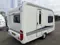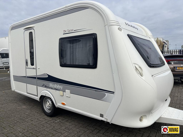 Nette Hobby caravan met een ruime zit die om te bouwen is tot bed. De caravan is uitgerust met een voortent.