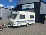 Nette en compacte Hobby De Luxe met een 2 persoons bed en treinzit. Voorzien van een Fietsenrek, Heki dakluik, Boiler Truma, Koelkast, Vouwwand, Ringverwarming, Serviceluik, Serviceluik, Schokbrekers, Stabilisator, Spotjes, Combi rollo's, Voortentlamp.