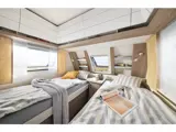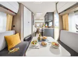 Stap binnen in een oase van moderne elegantie. Dit model is uitgevoerd met het fraaie meubeldecor Eiken Moyet, een warme en natuurlijke houtsoort die perfect contrasteert met de strakke, eigentijdse bekledingcombinatie Nero Sol. Een interieur dat rust uitstraalt en luxe ademt. Qua indeling biedt deze caravan alles wat nodig is. Voorin bevinden zich de lengtebedden met bergruimten eronder. Tussen de bedden bevind zich nog een lage kast. De slaapruimte is aan het zicht te ontrekken via een vouwgordijn. De sfeervolle zit achterin biedt een plek om bij slecht weer heerlijk te ontspannen of te dineren. Het keukenblok is voorzien van een 3-pitsgaskookplaat, spoelbak en lage koelkast. De toiletruimte met wastafel is ruim van opzet. De hangkast en de diverse grote en kleinere bergruimten maken deze caravan tot de ideale reisgenoot.