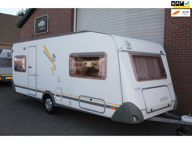 Deze caravan is voorzien van enkele bedden, rondzit, 4 persoons, mover, voor tent, kachel, vast toilet.