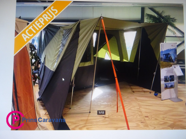 Afmetingen: Voortent van 250 x 260 cm, standaard met luifel van 120 cm.