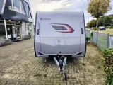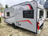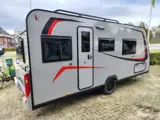 Grijze Polyester buiten wanden en dak, Buiten deur met raam, Zwarte aluminium velgen, Voorbereiding voor fietsen rek op achterwand,