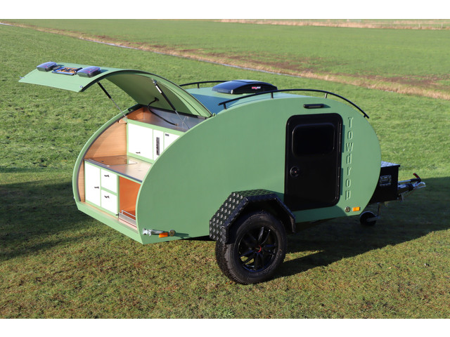 De Towdrop Europa is een compacte, lichte caravan die speciaal ontworpen is om reizen eenvoudiger, flexibeler en comfortabeler te maken. In tegenstelling tot traditionele, grote caravans heeft de Towdrop een gestroomlijnde, minimalistische opbouw waardoor je met weinig gewicht en maximale mobiliteit kunt reizen. Zelfs off-road is deze caravan bij uitstek geschikt. Deze mini-caravan is ideaal voor iedereen die graag op pad gaat zonder de rompslomp van grote caravans, maar wel wil genieten van een comfortabele slaapplaats en praktische indeling. Door het compacte formaat is Towdrop Europa eenvoudig te trekken met vrijwel elke auto — een regulier rijbewijs B is doorgaans voldoende en hij past zelfs achter kleinere voertuigen, wat reizen door Europa nog soepeler maakt. De caravan is afgewerkt in groen met een duurzame Turboliner-coating en beschikt over een geïsoleerd dak en vloer. Voor comfort en gebruiksgemak is hij voorzien van ventilatie via een Maxxfan Deluxe, deuren aan beide zijden met porchlights, en 12V- en 220V-aansluitingen binnenin.