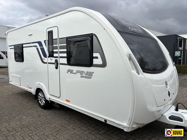 Nette Sprite Alpine Sport caravan met een fransbed. De caravan is uitgerust met een Kronings halfautomaat mover en een Brand voortent.
