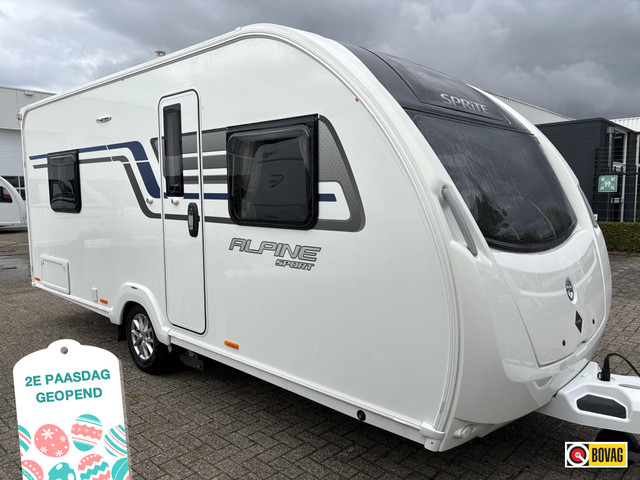 Nette Sprite Alpine Sport caravan met een fransbed. De caravan is uitgerust met een Kronings halfautomaat mover en een Brand voortent.