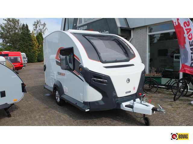 Dit is een zeer sportieve caravan met de deur achter in.