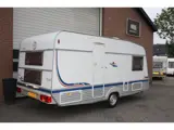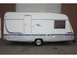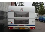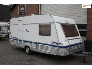 Deze caravan is voorzien van een midden keuken, vast toilet, kachel, voortent met luifel en erker, dwars bed, caravan is 5 persoons.