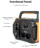It features 2 x pure sine wave AC ports, 2 x USB-C ports, 3 x USB-A outlets, 1 x cigarette lighter output, 3 x DC outputs, and wireless charging function.