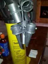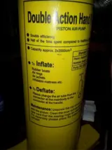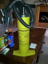 Gele handpomp met dubbele functie: opblaas en leegpomp.