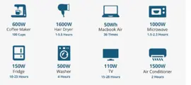 Charge Macbook Air for 36 times, phones for 180 times, or power microwave for 1.5-2.3hrs, fridge for 10-23hrs, hair dryer for 1-5.5hrs. The LiFePo4 battery can offer the portable power station 3500+ life cycles.