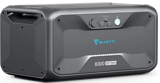 Boost your Bluetti AC300 (Max. 4), AC200Max (Max. 2), AC200P (Max. 1), EB200 (max. 1), and EP500 Pro (max. 2) portable power station with this 3072Wh B300 battery module.