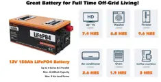 The 150Ah LiFePO4 battery has 1920Wh energy and 1280W max load, perfect for trolling motors, RVs, campers, marine, travel trailers, solar power systems, motor homes, UPS, off-grid, etc.