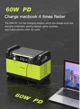Features 2 x Pure Sine Wave AC 230 V/1500 W, 1 x PD 60W, 2 x USB, 1 x QC 3.0, 1 x DC, this power station can not only charge up to 7 devices at the same time but also utilize a variety of charging methods, such as solar panels, power supplies and charging in the car.