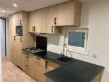 De keuken is uitgevoerd in een ruime L-opstelling met greeploze kastjes en beschikt over een gaskookplaat, afzuigkap, koelkast met vriesvak, spoelbak en praktische pannenlades.