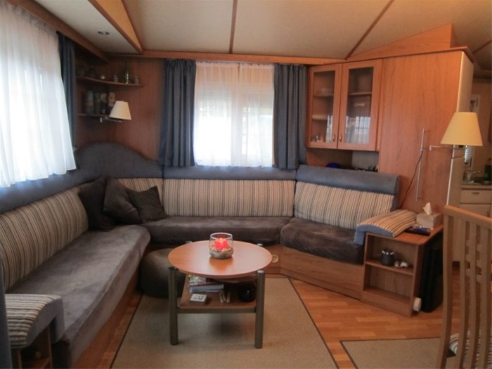 2slpkmrs, waarvan 1 met dressing.Badkamer met gr.douche. Keuken met gr. koelkast en diepvries, oven, gasvuur , micro, en dampkap.Ruime hoge living met zetelbed 2 pers.Ringverw. Truma 5002, elektr.geiser, install. voor elektr. 3000W, brand en gasdetectoren.Buitendouche met w/k water in hardhout, terras in hardhout.Tuinhuis.