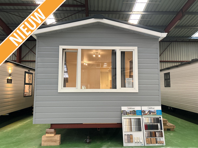 Het exterieur is standaard uitgevoerd met duurzame Eurotexx buitenbekleding, een zadeldak met aluminium getrokken goten en een panplatendak in antraciet kleur. Witte kunststof kozijnen met HR++ glas, een vlak raam aan de kopse kant, tuindeuren, een vlak plafond van 230 cm hoogte en een buitenlamp zorgen voor een lichte en uitnodigende uitstraling.