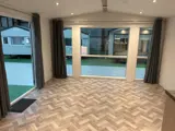 De grote raampartij aan de voorzijde zorgt voor een overvloed aan natuurlijk licht, waardoor de ruimte nog groter en lichter aanvoelt. De dubbele openslaande terrasdeuren nodigen u uit om naar buiten te stappen en volop van de omgeving te genieten. Het interieur is volledig voorzien van een moderne vinyl visgraatvloer, die niet alleen stijlvol oogt, maar ook eenvoudig te onderhouden is.