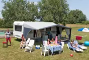 Onze comfortabele en ruime stacaravans (7,20 x 3,65) hebben 2 aparte slaapkamers, een grote woonkamer met een bedbank en een open keuken, een badkamer met wastafel, douche en aparte toilet. Warm water in de badkamer en in de keuken. Voortent compleet uitgerust met tafel, 6 stoelen, 2 ligstoelen en 2 klapstoelen, grondzeil van hoge kwaliteit, parasol en een extra koelkast van 225 liter. De stacaravan is voor 6/7 personen.