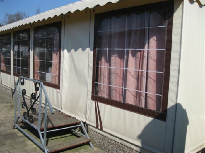 Prachtige stacaravan met zeer grote, verhoogde tent.
