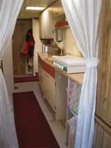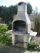 Wasmachine, tv in tent en tv in caravan, grote stenen barbecue.