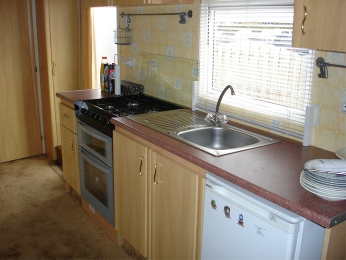 keuken met gasfornuis oven en koelkast . Ziet er zeer netjes uit