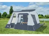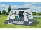 De voortent is voorzien van grote ramen en een deur, wat zorgt voor veel lichtinval en een prettig ruimtelijk gevoel. Met de optionele luifel creëer je een heerlijke veranda waar je beschut kunt genieten van het buitenleven.