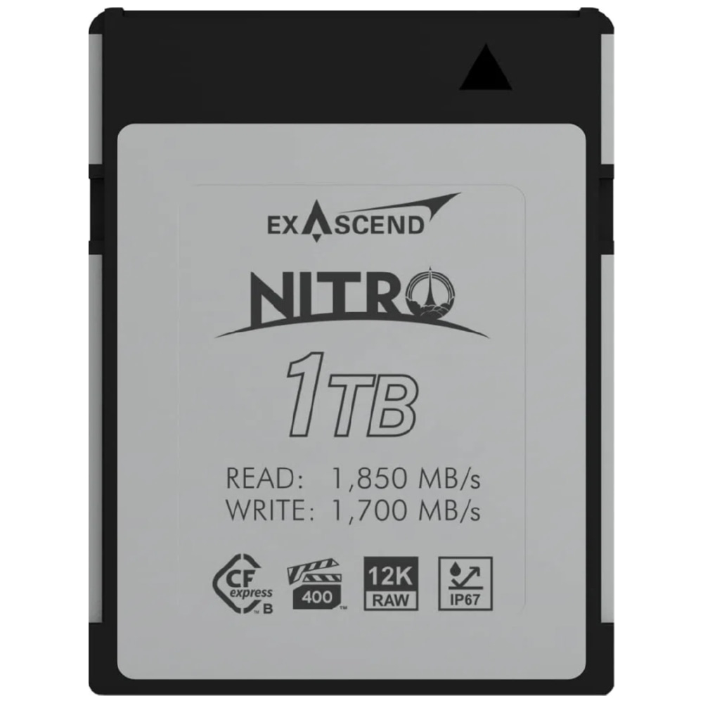 De Exascend Nitro CFexpress is een VPG-400-gecertificeerde CFexpress Type B kaart die hogere capaciteit en prestaties biedt dan bestaande VPG-400-gecertificeerde CFexpress Type A kaarten. Met minimum schrijfsnelheden van 400 MB/s kun je soepel opnemen zonder frames te verliezen.