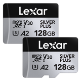 Deze set bestaat uit 2 Lexar MicroSDXC Silver Plus 128GB geheugenkaarten.