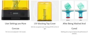 Anti-UV Light Hood: The transparent cover of this wash cure machine can block up to 99.95% of ultraviolet rays with a wavelength of 405nm, thus able to be effective in high resin solidification rate; and this wash and curing box adopts sealed cleaning, which effectively prevents the cleaning agent from splashing and volatilization, and provides more safety.