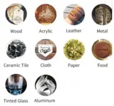 Available Materials of Engraving: Leather,- Wood Board, Paperboard, Black Acrylic, Food, Stainless Steel, Power Coated, Metal. etc.