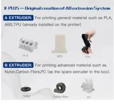 The X-PLUS 3D Printer Kit comes with two different types of extruder assembly. The extruder A had already been installed on the printer. The max printing temperature is 250C, and it can works well with PLA, ABS, TPU. For extruder B, free to you if you need. The maximum printing temperature is 300C, and can print Nylon, Carbon Fiber, PC. (The latest development, free trial).