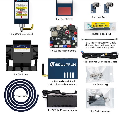 SCULPFUN S9 / S6 / S6 Pro / S30 / S30 Pro / S30 Pro Max to S30 Ultra 33W Upgrade Kit, 33W Laser Module, 0.08x0.10mm Laser Focus, 32-bit Motherboard, High-Speed Air Assist Pump, XY-Axis Limit Switch