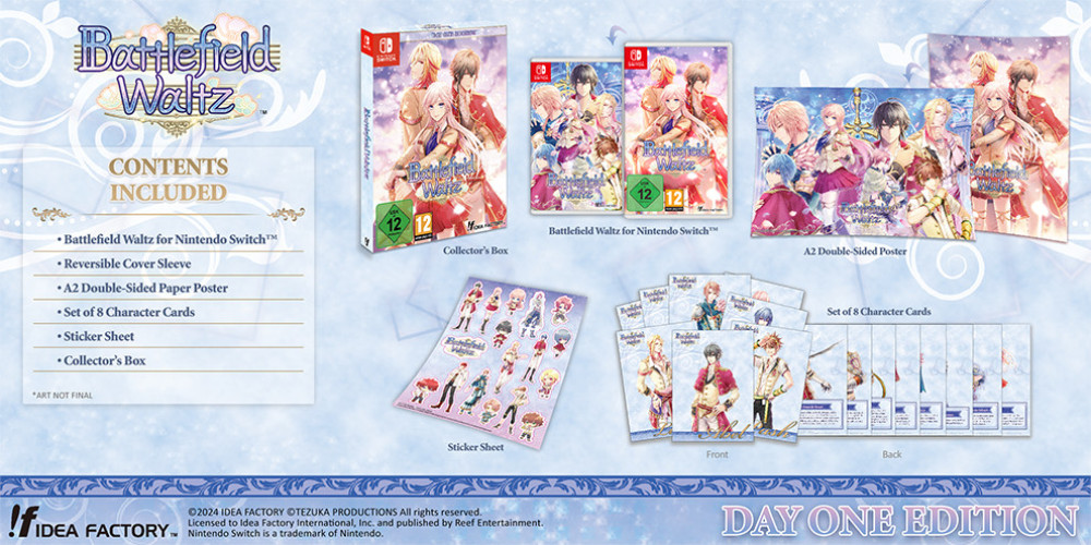 Day One Edition Inhoud- Battlefield Waltz voor Nintendo Switch- Omkeerbare hoes- A2 dubbelzijdige papieren poster- Set van 8 personagekaarten- Stickervel- VerzamelaarsdoosEerder uitgebracht in Japan op PS Vita in 2014, kunnen westerse fans eindelijk deze verborgen otome-parel ervaren en getuige zijn van Lan haar reis als de Maiden of the Cursed Sword op de Nintendo Switch.Ontdek New Frontiers en Nirvana! Met Map Exploration kunnen spelers twee kaarten vrij verkennen de Royal Capital Frontier en de Nirvana School, waar Lan kan communiceren met personages. Leer informatie over personages die alleen beschikbaar is tijdens Map Exploration.Chronicles of the Maiden of the Cursed Sword Met de Chronicle-modus kun je je huidige route bijhouden, ontbrekende paden noteren, teruggaan om alle eindes te vinden of gewoon je favoriete scnes opnieuw afspelen! In de Chronicle-modus kun je eerder gespeelde scnes selecteren om het spel te starten vanaf elk punt dat je hebt gespeeld in je huidige route!Ancient Memories schitteren als een juweel! Nadat je aan bepaalde in-game voorwaarden hebt voldaan, krijg je toegang tot Ancient Memories, dat een boek toont dat is ingelegd met edelstenen die oplichten bij elk goed einde dat je hebt bereikt. Ontgrendel alle goede eindes om de oude herinneringen te ervaren die verborgen zitten in het magische zwaard!