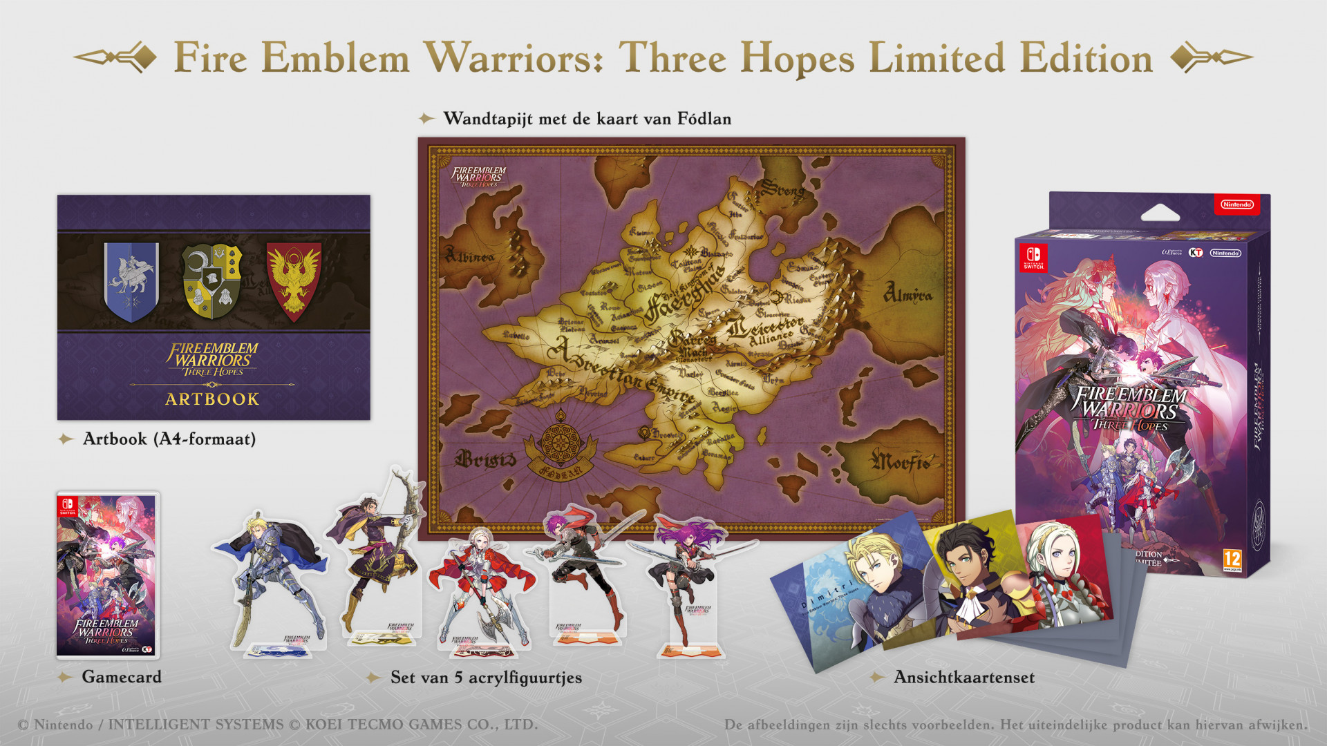 Inhoud Limited Edition- Fire Emblem Warriors Three Hopes game card- Artbook,- Tapestry map- 5 Acrylic figures- Character postcard setFire Emblem Warriors Three Hopes Vergezel personages uit Fire Emblem Three Houses en vecht mee in enorme veldslagen in het door oorlog verscheurde Fdlan. Edelgard, Dimitri, Claude en andere personages uit Fire Emblem Three Houses keren terug om hun vechtkunsten te vertonen. Ontketen vernietigende combos en flitsende speciale aanvallen in spectaculaire real-time gevechten. Kruip in de huid van personages uit Fire Emblem Three Houses en hak je een weg door hordes vijanden. Versla talloze vijanden met de bijl van Edelgard of de lans van Dimitri, of val van een afstand aan met de boog van Claude. Hak en sla je een weg naar een betere toekomst voor Fdlan. Fire Emblem Warriors Three Hopes wordt op 24 juni uitgebracht voor de Nintendo Switch.