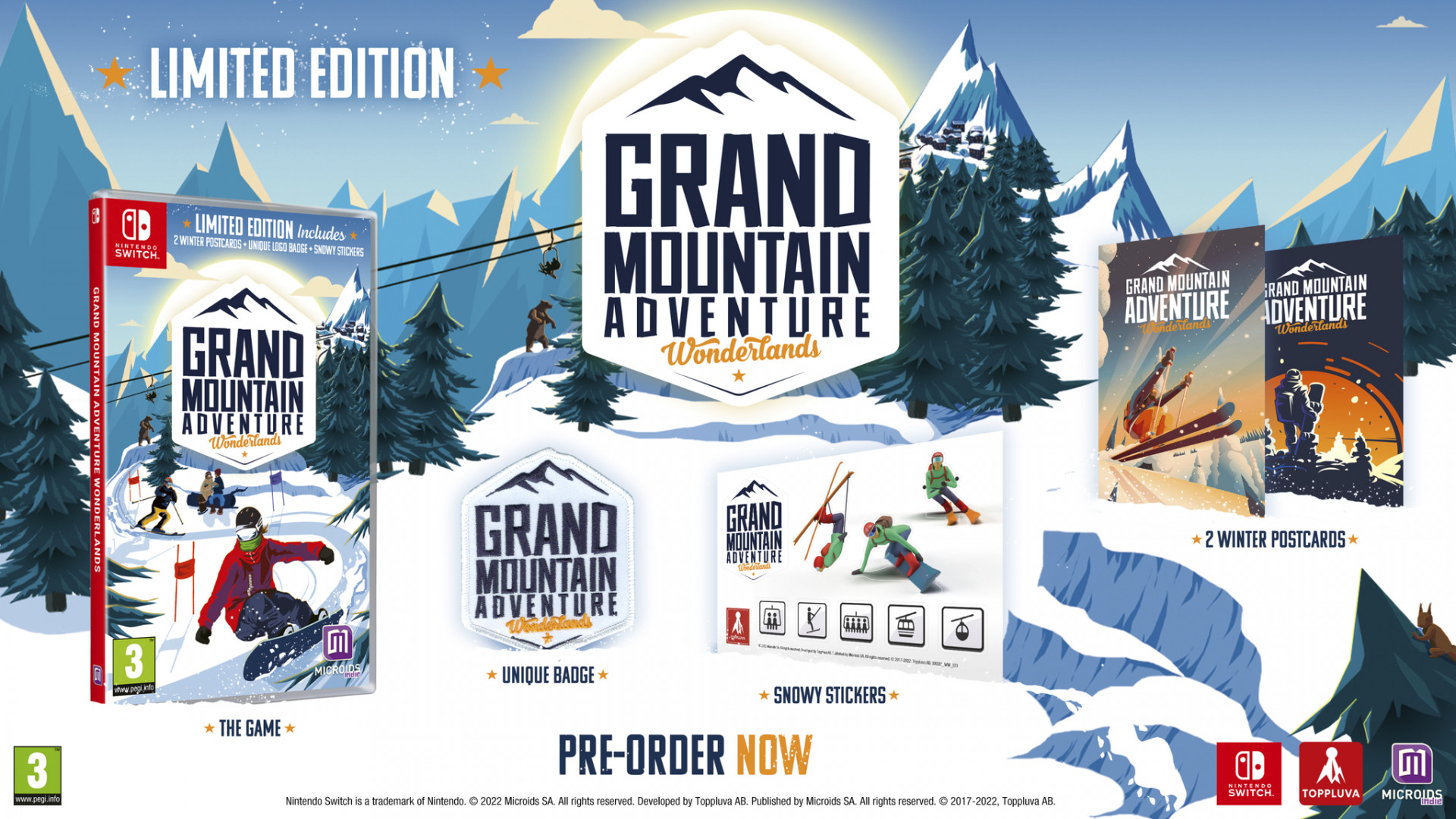 Grand Mountain Adventure Wonderlands laat je vrij en in je eigen tempo hele skigebieden en de omliggende bergen verkennen. Ontgrendel skiliften en bereik nieuwe gebieden door uitdagingen aan te gaan of geniet van het landschap terwijl jij en je eigen pad door de bergen. Zin om plezier te maken met je vrienden? Ga door en speel in lokale multiplayer voor maximaal 4 spelers. De keuze is aan jou!Er zijn 12 complete bergen in de open wereld om te verkennen. Elk vanaf een andere plek in de wereld en met zijn eigen unieke architectuur, omgeving en gevoel.Kenmerken- Verkenning maak je skis of snowboard vast en verken 12 enorme skigebieden in de open wereld. Ontdek poederachtige backcountry-gebieden, diepe bossen met dieren in het wild, drukke hellingen, steile kliffen, hoge toppen en gezellige bergdorpjes.- Uitdagingen doe mee aan Super G, Slopestyle, Big Air en vele andere disciplines. Zoek naar verborgen uitdagingen en geheime proeven buiten de hellingen. Verzamel de hele tijd skipassen, de game-verzamelobjecten!- Multiplayer speel in lokale multiplayer voor maximaal 4 spelers. Race naar de finish, gooi elkaar met sneeuwballen omver of vaar samen door de bergen. Voel je vrij om samen de berg te verkennen.- ZEN-modus ZEN-MODUS draait om een rustige en regenererende tijd voor jezelf. Alle uitdagingen, proefverzamelobjecten en zelfs NPC zijn verwijderd!De Limited Edition bevat- Het spel- Unieke badge- Sneeuwstickers- 2 winterse ansichtkaarten