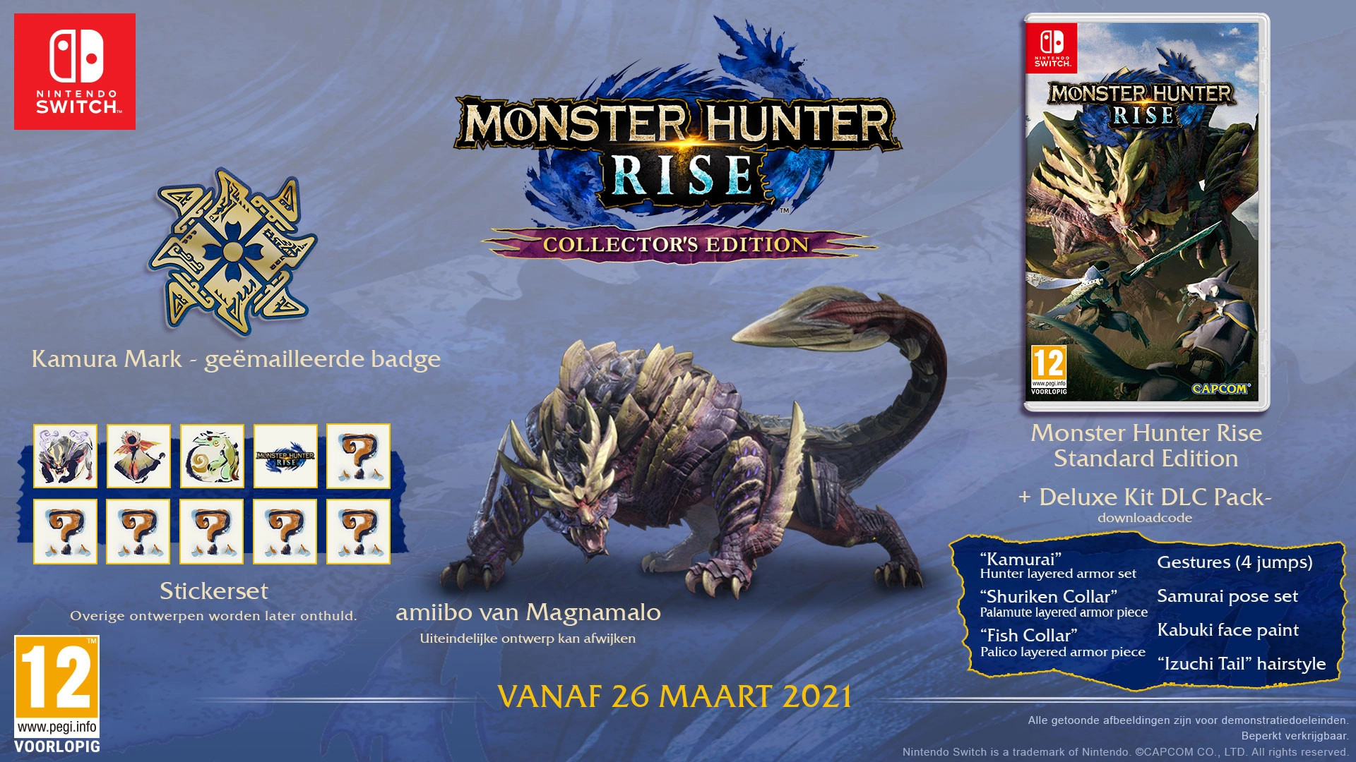 De Collectors Edition van MONSTER HUNTER RISE bevat - een gamecardversie van de game- een downloadcode voor het Deluxe Kit DLC Pack- een amiibo van Magnamalo- een Kamura Mark-badge - een stickersetDe Monster Hunter-serie stijgt boven zichzelf uit met MONSTER HUNTER RISE. In deze nieuwe game beschikken spelers dankzij speciale wezentjes over de mogelijkheid om kliftoppen te bereiken en kunnen ze de hoogteverschillen in het landschap in hun voordeel gebruiken.In de nieuwste game binnen de actie-RPG-serie maken spelers jacht op angstaanjagende monsters en klimmen ze naar nieuwe hoogten. Maak je klaar om af te reizen naar het kleurrijke Kamura Village, een sereen bergdorpje waar spelers worden ondergedompeld in een unieke cultuur en innovatieve jachttechnieken kunnen leren. Met een speciaal insect dat een Wirebug wordt genoemd, kunnen spelers op een unieke manier door de gebieden navigeren, waardoor het zelfs mogelijk is om kliftoppen en hoge gebouwen te bereiken. De gebieden in de verschillende quests zijn niet opgedeeld in zones, waardoor spelers de uitgestrekte landschappen zonder tussentijdse laadtijden kunnen verkennen.
