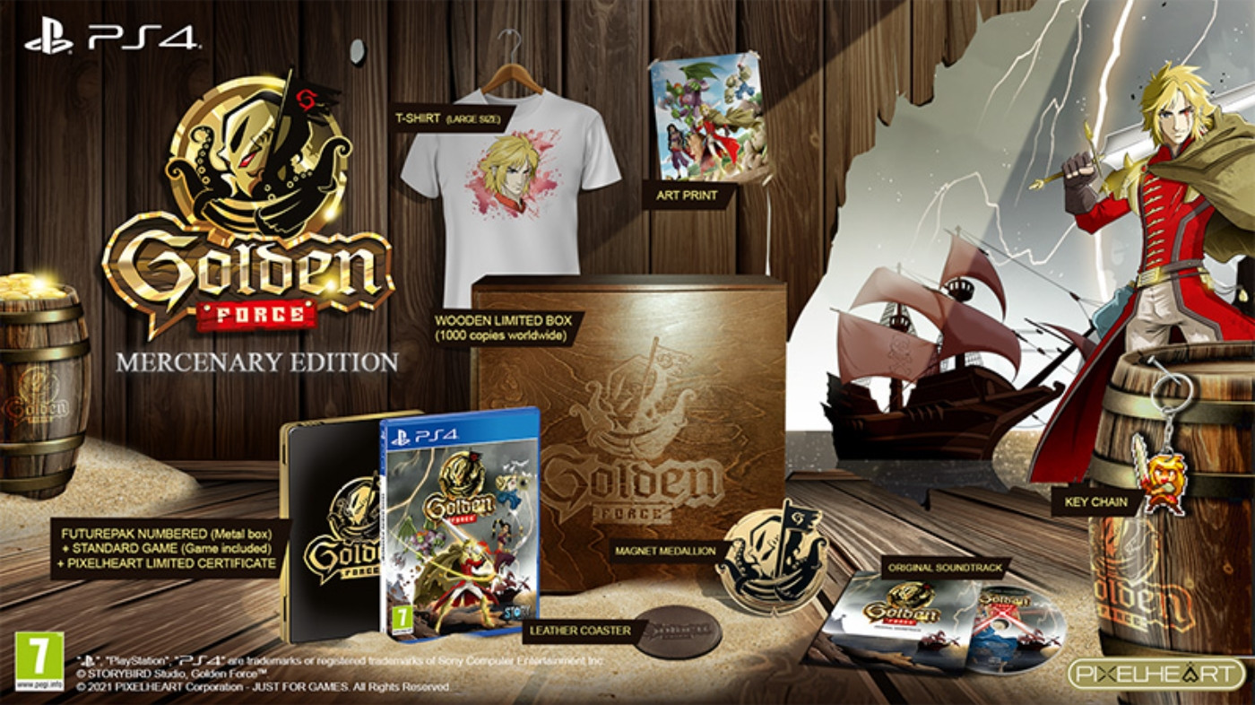 De King of Demons zette zijn zinnen op Muscle Island, een paradijselijke en vredige plek waar het goed leven is. Deze slechte persoon vestigde zijn leger en vervolgt de bevolking met de hulp van zijn generaals.Door hun laatste munten te verspillen in de tavernes van het eiland, genieten huursoldaten van de vreselijke GOLDEN FORCE van hun laatste momenten van vakantie wanneer ze een nieuw contract ontvangen sla deze nieuwe kwaadaardige heerser neer en herstel de berg met goud in zijn bezit.Als er goud is en de belofte van grote veldslagen, kun je op de GOUDEN KRACHT rekenen om je huid te redden!Kenmerken- 4 werelden vol uitdaging.- Old school moeilijkheid (maar niet zo frustrerend).- Coperatieve modus voor 2 spelers.- 4 speelbare personages.- Angstige bazen.- Tal van geheimen en verborgen uitdagingen voor hardcore gamers.Deze Mercenary-editie bevat De standaard speldoos (inclusief spel) 1 FuturePak (Steelbook PS4-formaat) met specifieke nummering Magneetmedaillon (Grote munt Golden Force) inbegrepen in het FuturePak- Orginele soundtrack artwork T-shirt (Large formaat) 1 Leren onderzetter Sleutelhanger (Gutz karakter) in Pixel art