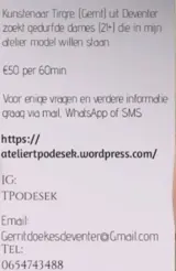 Hallo Dames, Tekenaar (Gerrit) uit Deventer zoekt een gedurfde dame die model wil staan, in gewone en/of erotieke poses. Ik kan ontvangen in mijn eigen atelier in Deventer. Ik betaal €50* per 60min** voor het maken van schetsen in die tijd. Hou er rekening mee dat de tijd ietwat kan uitlopen. Bij meer dan 15 min word uitloop vergoed. *in tikkie of PayPal ( Alleen wanneer de dame bij mijn atelier aangekomen is ivm oplichters.) ** Hou er rekening mee dat modellen op kunstacademie €20 per uur betaald krijgen. Enige opmerkingen of klachten over het bedrag zullen worden genegeerd. Voorkeur gaat uit naar slank tot volslanke dames. Leeftijd van tussen 22 en 40. Graag jouw reactie met je naam, je leeftijd, de dagen en tijden dat je kan/wil via App/messenger/SMS. Bellers worden genegeerd en geblokkeerd. Voor vragen en meer info, App/mail/SMS gerust. Groeten, Gerrit.
