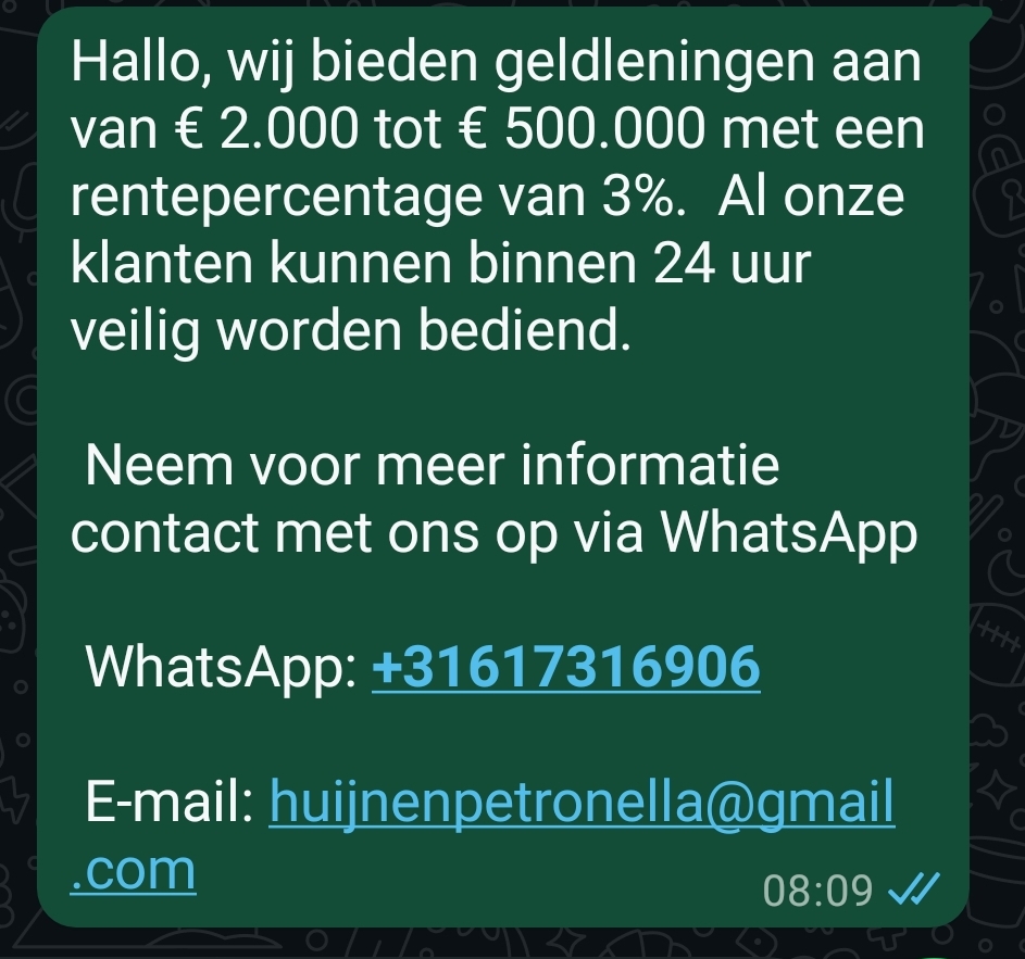 Hallo, wij bieden geldleningen aan van € 2.000 tot € 500.000 met een rentepercentage van 3%.  Al onze klanten kunnen binnen 24 uur veilig worden bediend.