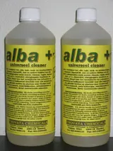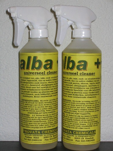 Alba + verwijdert vet, olie, rook- en nicotinevlekken, schimmel, was, roet, inkt, kleurstoffen, lippenstift, algen, en andere vlekken van alle harde en zachte ondergronden! ALBA + is de universele reiniger waar geen vuil tegen bestand is. Door de speciale samenstelling wordt de oppervlaktespanning doorbroken zodat de cleaner diep kan doordringen en zelfs het taaiste vuil en vet kan oplossen. ALBA + dringt diep door, is een veilig en snel reinigingsmiddel, en al naar gelang de vervuiling te verdunnen met water, 100% brandveilig en niet giftig. ALBA + is biologisch afbreekbaar, draagt dus niet bij tot milieuvervuiling, eenvoudig aan te brengen in het gebruik, en laat geen aanslag achter, oppervlakken komen weer helder en schoon te - voorschijn. Geen vettige aanslag, geen neutralisatie vereist. ALBA + vervangt veel producten!!! Waar kan men Alba+ universeel cleaner gebruiken? INDUSTRIE. ALBA + is veilig voor het reinigen van machines, muren, betonnen vloeren, kleine onderdelen, precisie-instrumenten, kunststof en damwandprofielen.