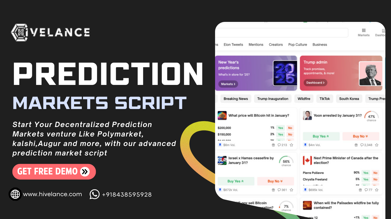 Hivelance is a trusted Prediction Market Script Development Company known for delivering scalable, high-performance platforms. We offer complete development, API integrations, oracle integration, and advanced automation powered by AI and machine learning for better predictions.